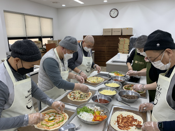 4월 22일(수), (사)자비신행회에서 중현스님의 행복한 피자가게가 문을 열었습니다. 오전에 먼저 온 피자 반죽팀은 맛있는 도우를 위해 열심히 재료를 배합해서 반죽을 발효를 시킵니다. 오후 1시 부터는 피자가게 사장님인 중현스님과 직원이자 봉사자인 신도분들이 모여 본격적으로 피자 만들기에 돌입합니다. 토핑을 잘 올려야 타지도 않고 구웠을 때 모양이 예쁘게 잘 나옵니다. 오늘 행복의 피자는 동구 아동센터인 드림스쿨, 학동, 한마음, 북구 아동센터인 비젼, 꿈나무, 풍향 에서 각각 5판 씩 전달하였습니다.