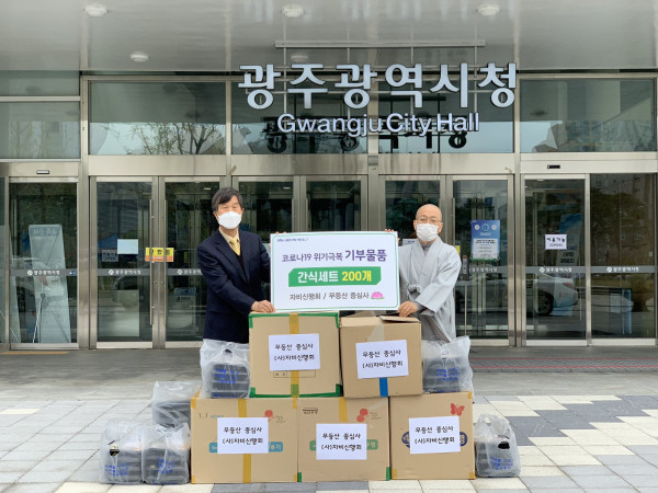 4월 10일(금), 오전 9시 (사)자비신행회에서 증심사 주지 중현스님 이하 증심사 신도분들이 모였습니다. 간식세트 준비에 앞서 주지 중현스님은 '증심사 신도님들은 열심히 기도하시는 분들이 많이 계시는데, 이번 코로나를 계기로 기도뿐만 아니라 봉사도 열심히 하는 신도가 되었으면 한다'며 '오늘 참석해 주신 분들은 봉사에 앞장서서 하시는 분들이니 자부심을 가져도 좋다'는 감사와 응원의 말씀을 전하였습니다.