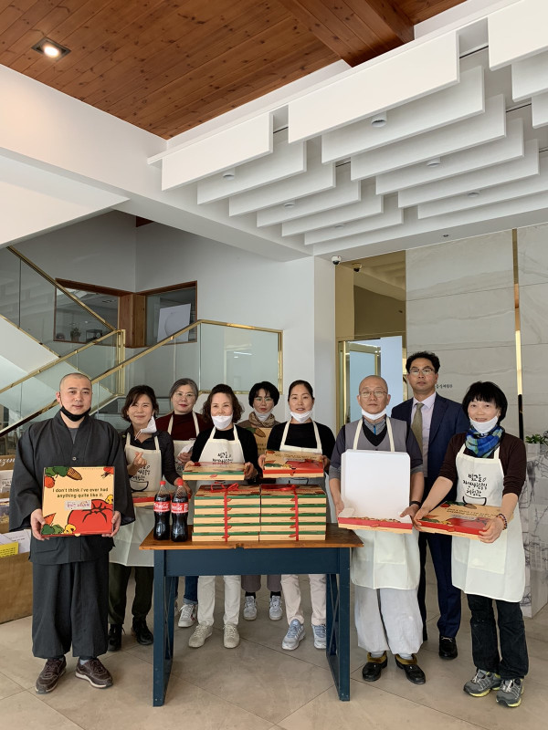 3월 25일(수) 오전 11시, 주지스님, 진훤스님, 피자가게 봉사자 8명이 자비신행회에 모여 행복한 피자를 만들었습니다. 주지 중현스님은 피자를 만들기에 앞서 봉사자 분들에게 ‘큰 맘 내서 봉사하는 것이 아니고 일상적으로 봉사해야 한다’며 ‘오늘도 열심히 봉사합시다.’는 당부의 말을 전했습니다.
