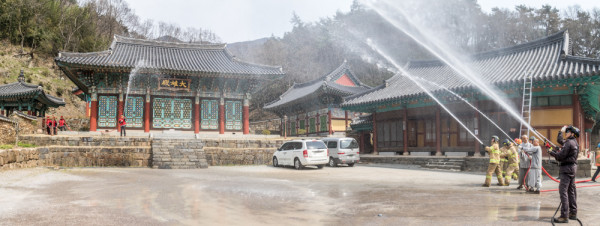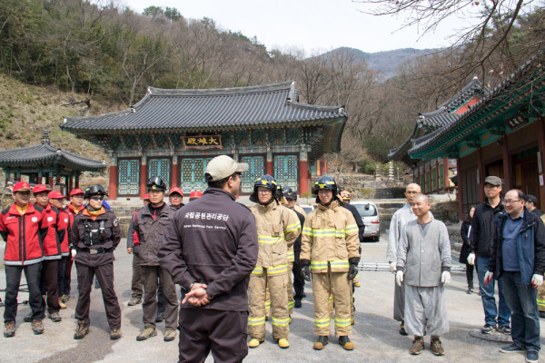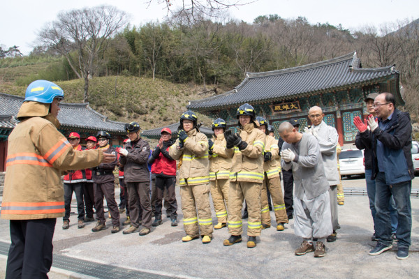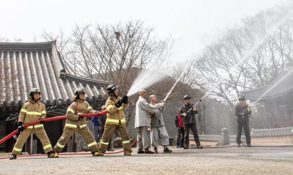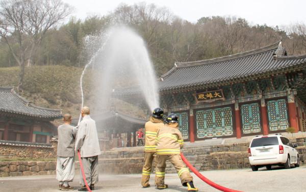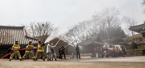 증심사의 한옥 건물과 문화제로 인한 화재발생을 대비한 소방훈련이 증심사 앞마당에서 이루어졌고,